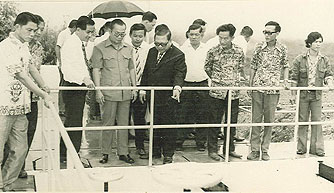 70年代,黄锡琦向时任砂州副首席部长拿督沈庆鸿讲解古晋税务局滤水站的运作情况。