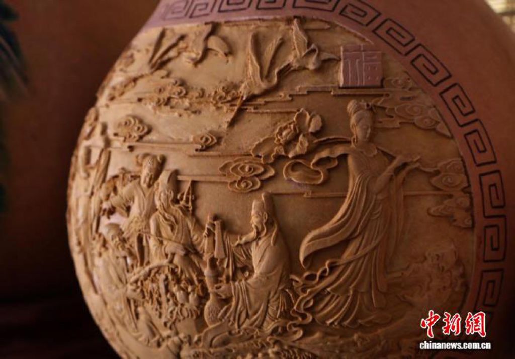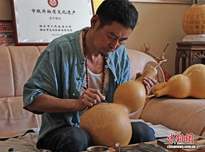 山东烟台手艺人葫芦上巧琢 “八仙过海”