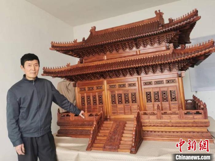 62岁的胡平是吉林省吉林市的一位木匠。最近,他凭高超的技艺完成了一个清代建筑模型。