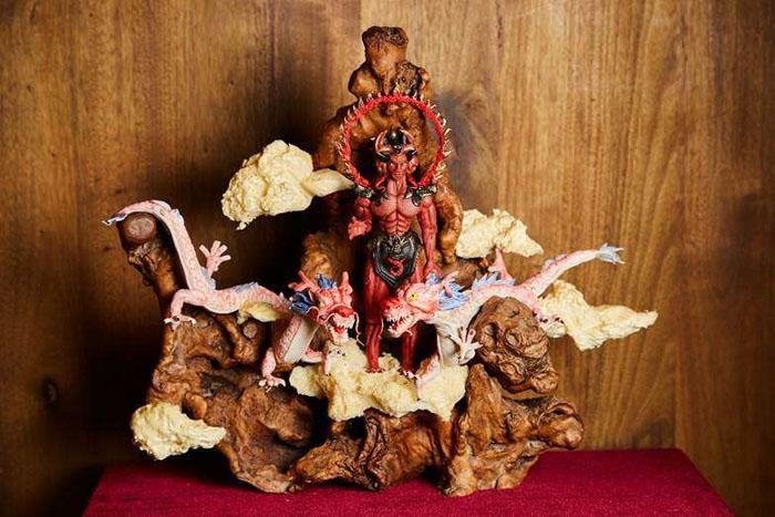 比如在创作《山海经》面塑作品时,郎佳子彧以个人的理解对传统文化进行二次创作,其中“火神祝融”血脉偾张、通体赤红,被两条龙围绕,完全不同于传统面塑。“因为在我的设想中,火神非常具有力量感,就尝试了一种更为夸张的视觉效果。”郎佳子彧认为,一件作品如果只有技巧很难打动人,一定要有创作者的思考和让人产生共鸣的内容。