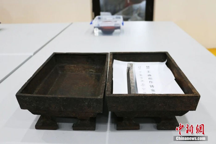 专家们在部分青铜器上发现有长短不一的铭文,最多的一件有28字。一件青铜簠上刻有铭文“楚王酓前作铸金簠以供岁尝”,据古文字学者的最新研究,“酓”字和“熊”字的古音相近,可以通假。在曾侯乙墓出土的楚惠王鎛钟上面“熊章”就写作“酓章”。“楚王酓前”即楚考烈王熊完(亦作“元”)。