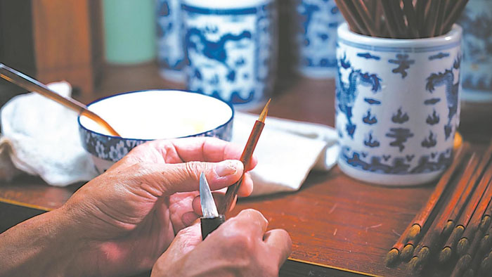 日前,国家级非物质文化遗产“宣笔制作技艺”代表性传承人佘征军在安徽省非遗传习基地展示宣笔制作技艺。