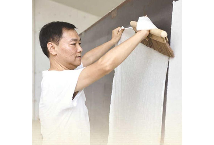 毛胜利介绍,“水深火热”是宣纸的两大关键环节。“水深”就是捞纸,“火热”则是晒纸。用竹篾编成的纸帘在浆水中捞提,两个捞纸工需要高度协调,才能保证每张纸的厚薄均匀。晒纸则是捞纸后的一道工序,先将架子上湿漉漉的宣纸揭下来,再将宣纸一张张分开,“晒”在加热的钢板焙面,最后用松针刷将纸慢慢刷平。2006年,宣纸制作技艺被列入首批国家级非遗。2009年,宣纸制作技艺被联合国教科文组织列入人类非物质文化遗产代表作名录。
