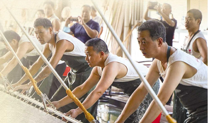 在“中国宣纸之乡”宣城泾县的中国宣纸股份有限公司三丈三“超级宣纸”生产车间里,44名技艺精湛的捞纸工匠齐心协力共同抬起巨型竹帘制作宣纸。