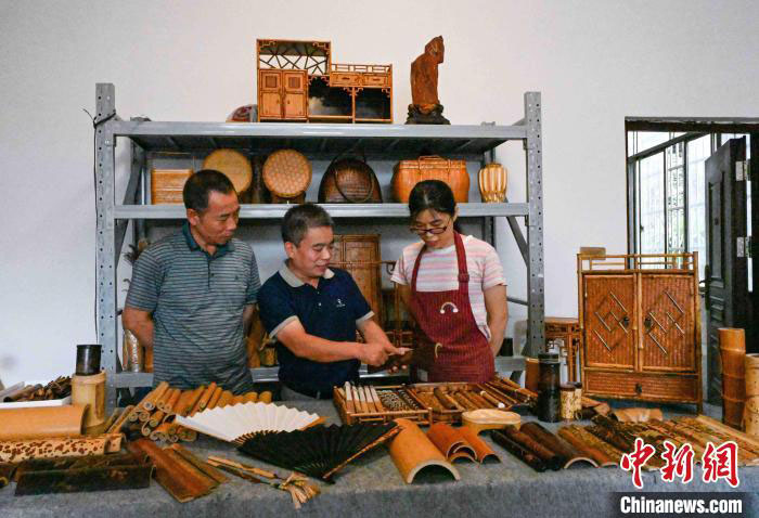 在国内的一次展会上,金辉看见日本回流的竹制博古架,打开了他开发竹制工艺品的思路。金辉一家在全国各地学习竹编技艺,研究解决南方发霉、北方开裂变形的技术,不仅制作出造型精美的文玩摆件,还制作出大型的竹制家具,而竹制家具折射出的环保理念颇受消费者青睐。