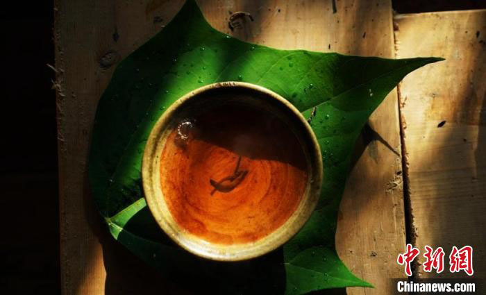 从火塘取几块烧红木炭,放到葫芦瓢中上下颠簸,待高温稍退和着茶叶拌炒,尚未焦煳之时捡出木炭,将茶倒入土罐煮沸,再用土碗装盛,茶水轻抿,满口回甘,瞬感宁静与放松……