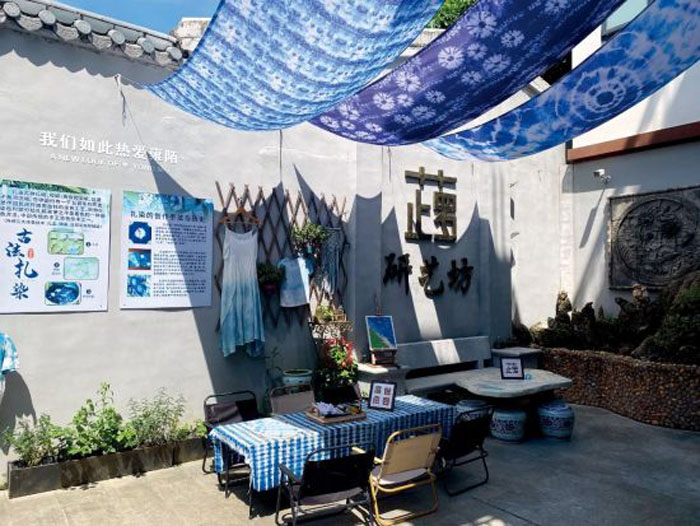 从西栅郑公祠和华侨楼之间小路走上去,走到雍陌上街,顺着昔日的岐澳古道一路向东,很难不被一面古旧砖墙边的绿植和墙上“保持热爱”四个印在染布上的大字吸引。顺着院墙左拐,读着墙上的涂鸦:“无论如何,属于你的礼物一定会来的。”“今天也一定是很棒的一天!”“一家可以收获快乐的店。”一路走过去,一条条扎染布匹,在院落随风轻轻地摆动,芷萝研艺坊的主理人郑绮筠正在整理展示台上的扎染和手工艺品。扎染是一种古老的民间工艺,宋朝《资治通鉴音注》中便有记载,如今成为了非遗技艺之一。