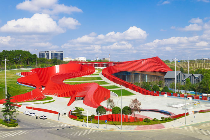 乘坐航班前往贵阳的游客,若在贵阳龙洞堡机场上空俯瞰,可发现有一座巨型建筑铺展在青山绿水之间。它由一块块红色的曲面幕墙构成,此起彼伏,形成了连续转折的动态轮廓,犹如一条灵动的“红飘带”。它就是全国首个以长征为主题的全域沉浸式数字科技体验馆,也是长征国家文化公园贵州重点建设区的标志性、引领性工程。