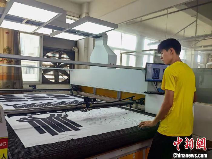 走进木乐镇,在主干道旁,一家服饰加工企业正有条不紊地开展生产。只见数码车间一工人熟练地启动机器,印有服装样式的布料在机器的传送下缓缓展开,“嗡”的一声响起,激光笔按照预定程序,沿着样式边线切割布料。