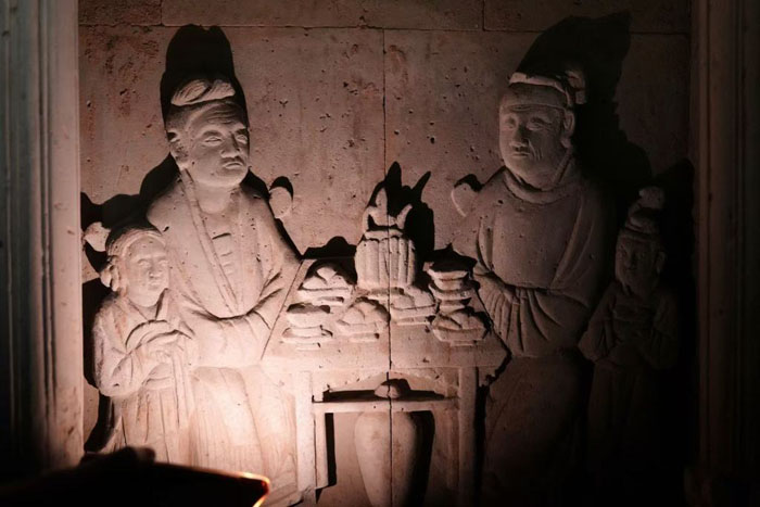 例如,在二号墓室中的“开芳宴”,是宋金墓中流行的装饰题材。这是夫妻之间一种特定的宴席,始于唐、发展于宋、鼎盛于金,至元代走向没落。只见男女墓主人分别坐在桌子两旁宴饮、观赏散乐杂剧,侍者立于左右听候吩咐,帐幔卷帘、屏风桌椅、盘盏箱柜一应俱全。