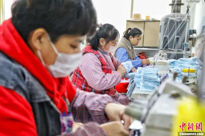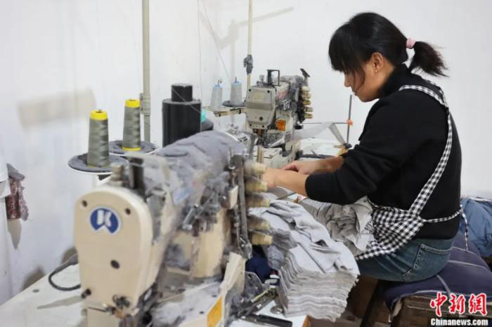 在一间民房改造的加工车间里,53岁的姚淑民正熟练地操作着缝纫机,给秋裤做最后的收腰工序。“最早的时候,我们用剪刀裁剪,再用脚踏缝纫机缝制,一天最多做20条。现如今,各家各户更新了自动化设备,5分钟就能做出一条秋裤,一天大概能做1300条到1400条。”